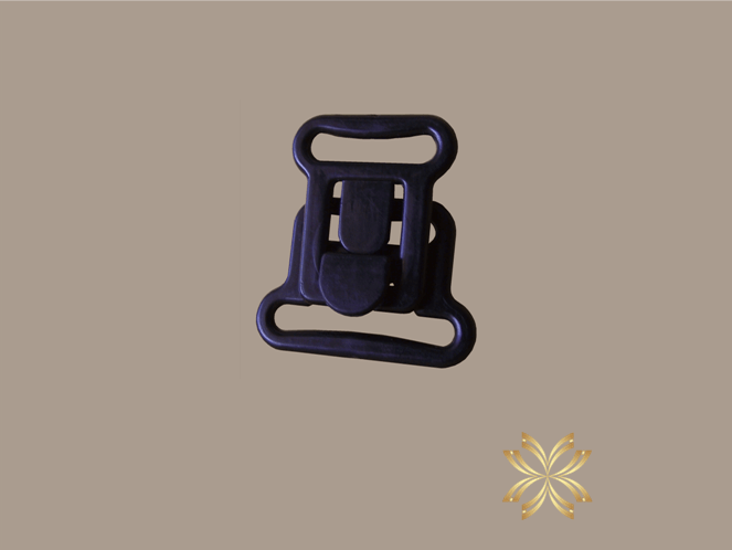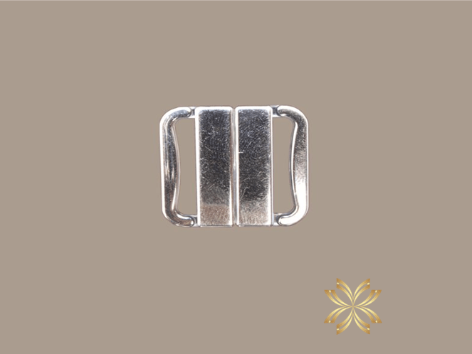 Fecho frontal 20mm com acabamento em hot stamping prata ou dourado.